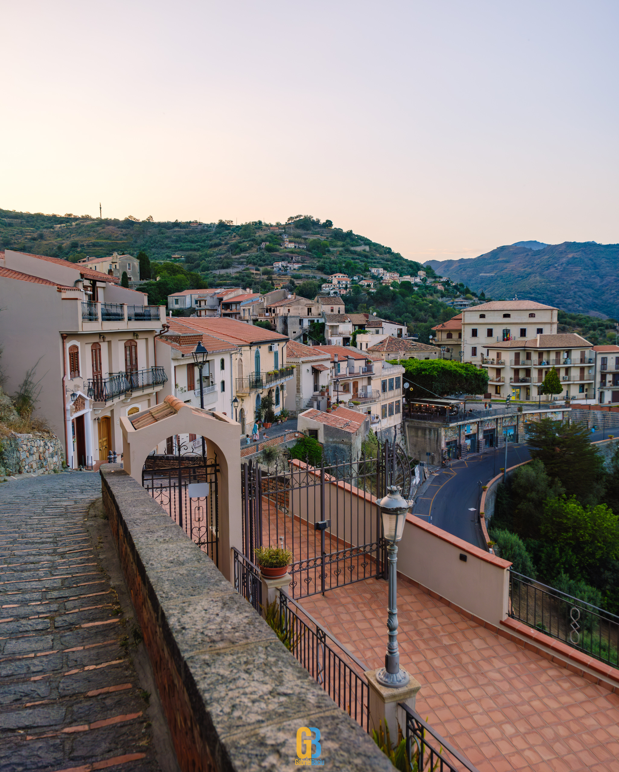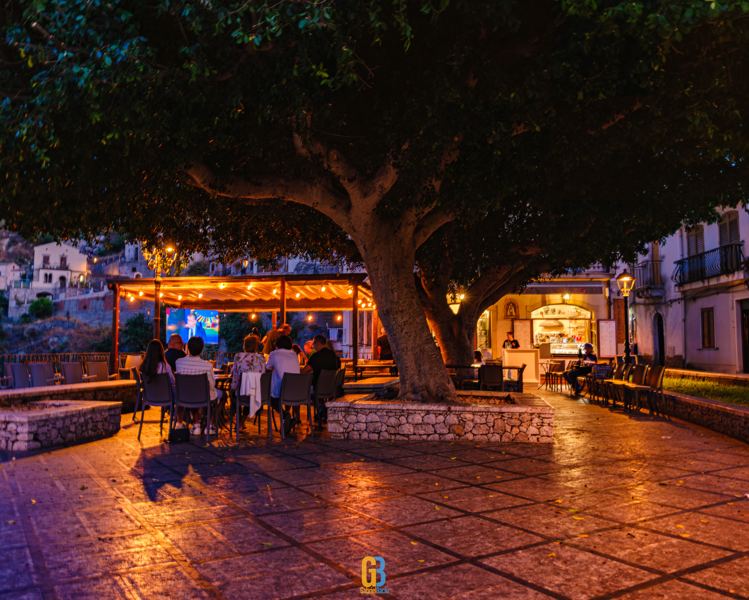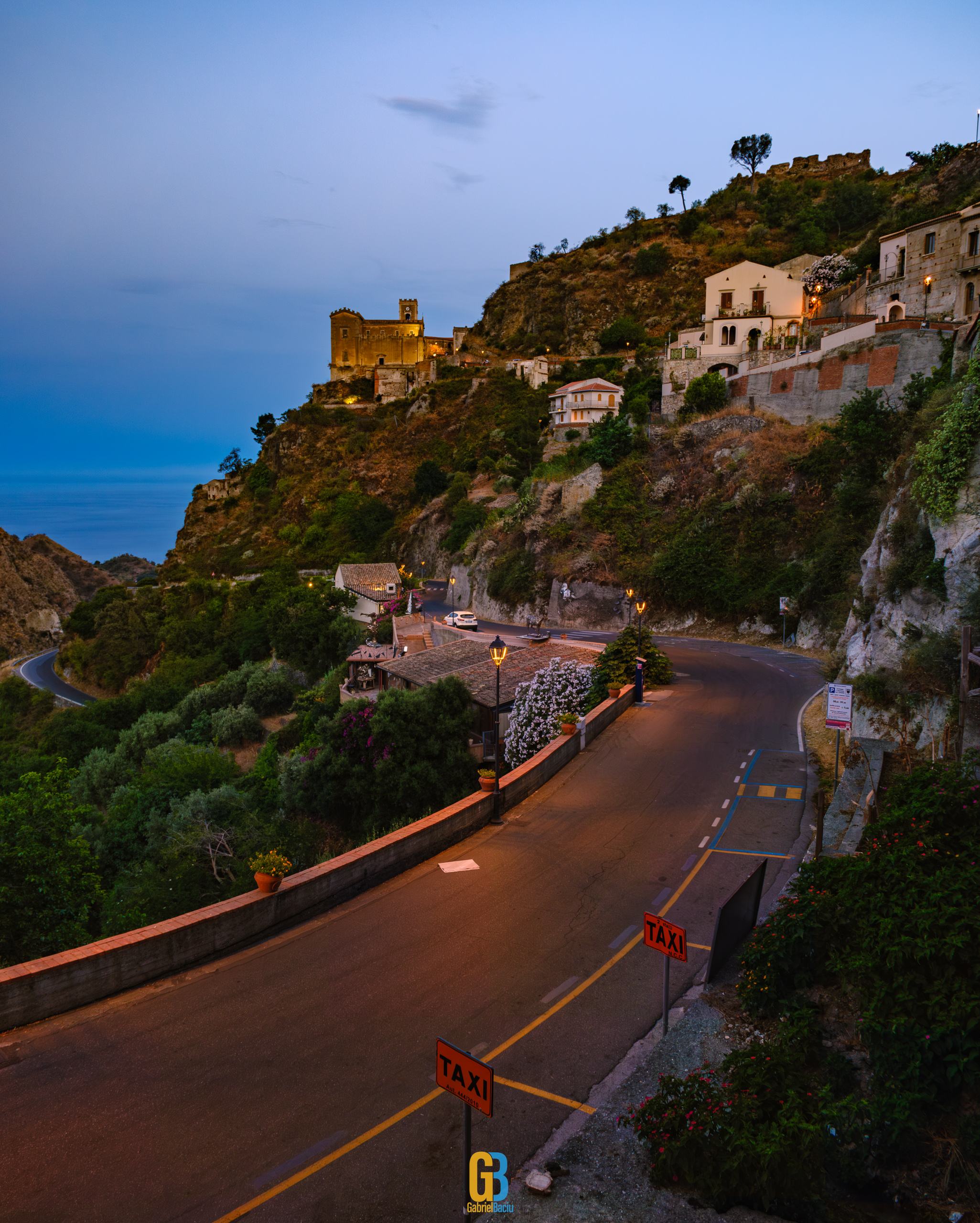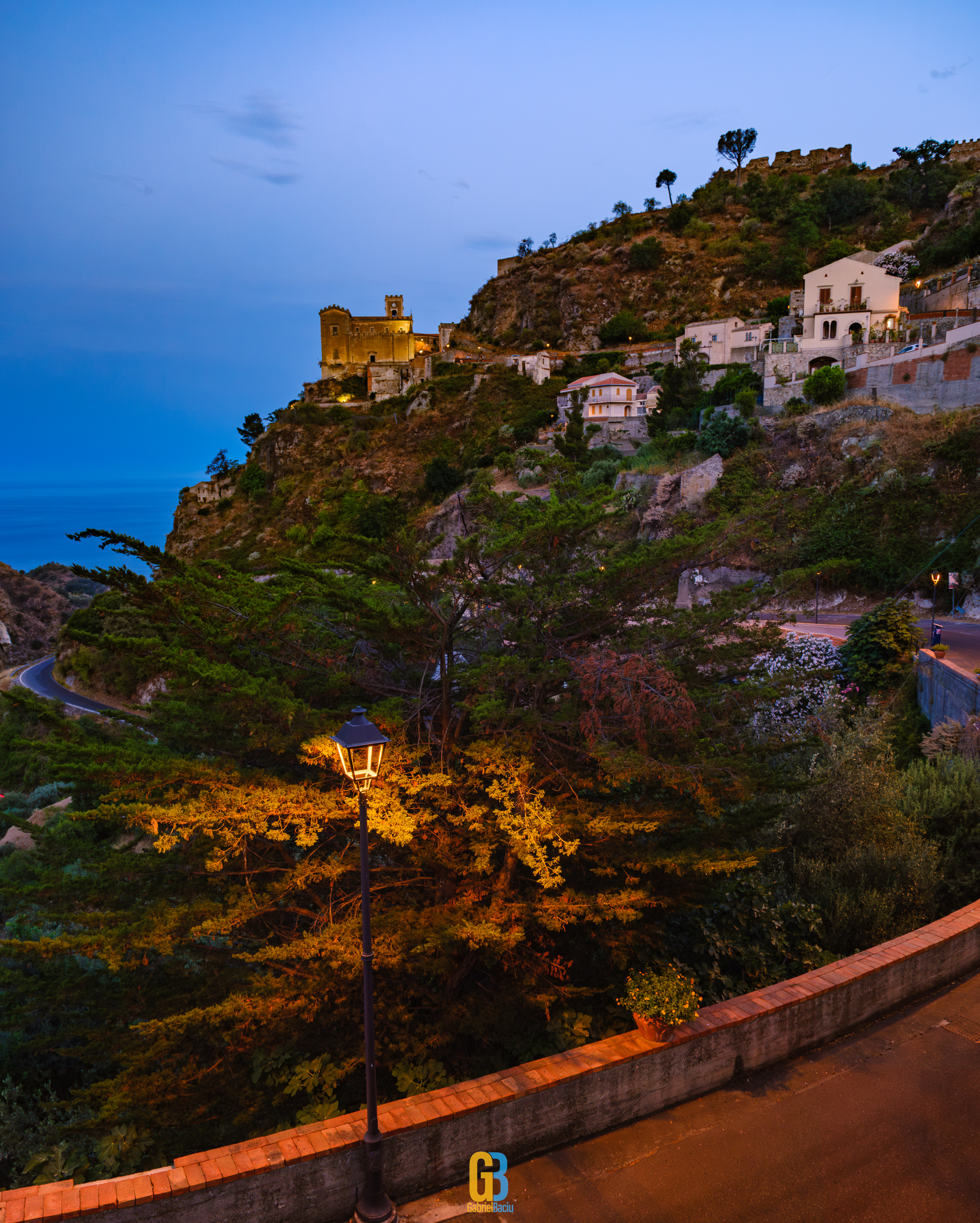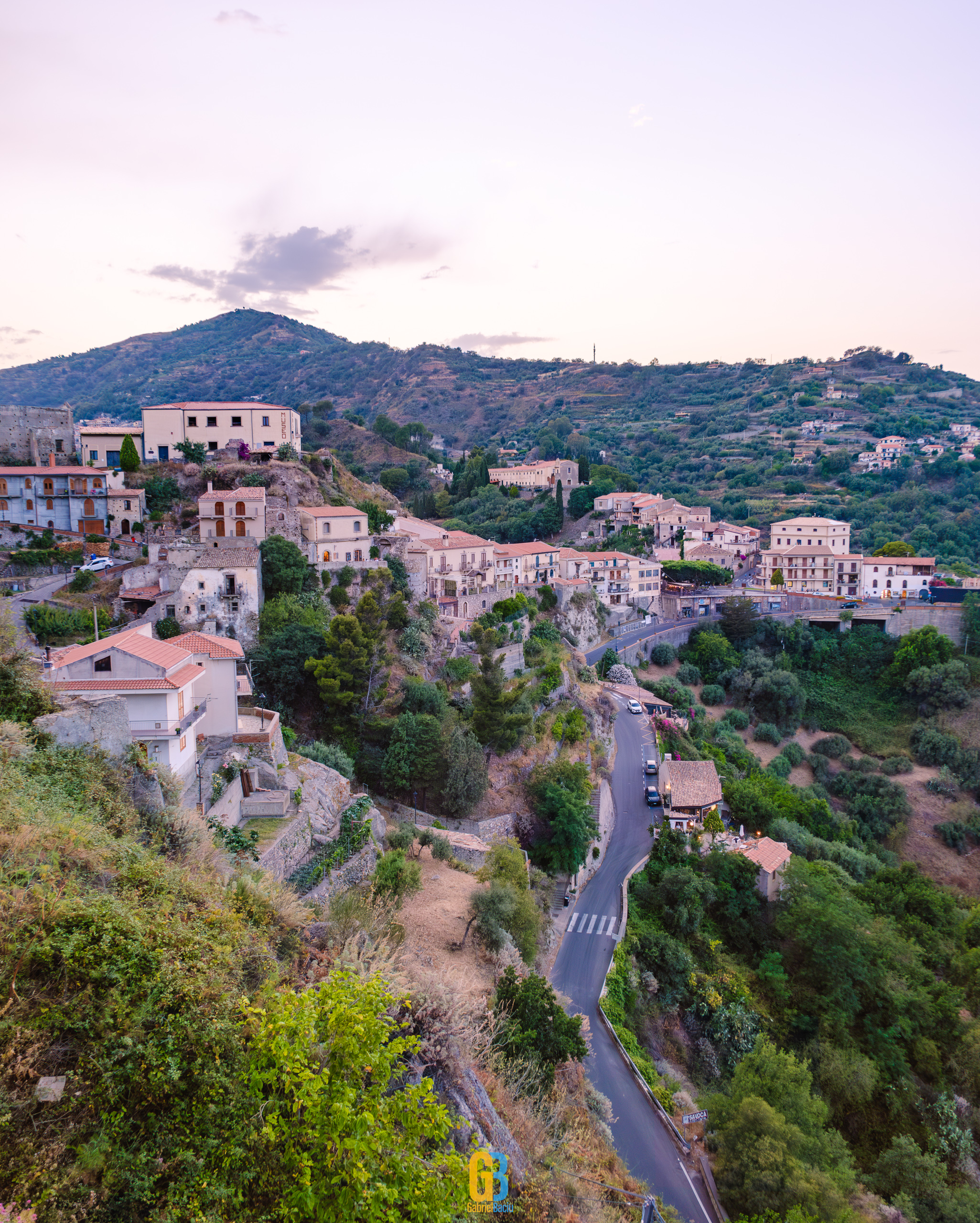 Dacă barul e interesant și cam atât, nu același lucru se poate spune și despre localitate în sine, care este îngrijită și șerpuiește frumos pe coama munticelului și se termină teatral cu o biserică catolică construită în secolul XIII. Într-o parte se vedea spectaculos valea cu serpentinele pe care tocmai venisem, iar mai departe se vedea marea și mai departe Italia continentală. Și s-a lăsat seara cât ne plimbam noi pe acolo și s-au aprins luminile stradale iar liniștea era spartă doar de ceva muzica italiană ce se auzea de la una dintre terase la un volum numai potrivit pentru a crea atmosferă. La o altă terasă, cea a pizzeriei de vis-a-vis de Bar Vitelli, câțiva localnici se adunaseră să vadă împreună un meci pe care naționala Italiei îl juca în Campionatul European de Fotbal. Sincer, nu știu cum e ziua acolo, cât de aglomerat este, dar atmosfera din momentul ăla și priveliștea mă făceau să mă imaginez stând un weekend întreg acolo, ziua plimbându-mă în natură, seara savurând un pahar de vin alb din struguri de viță de vie de pe Etna. Așa să-mi ajute Dumnezeu.