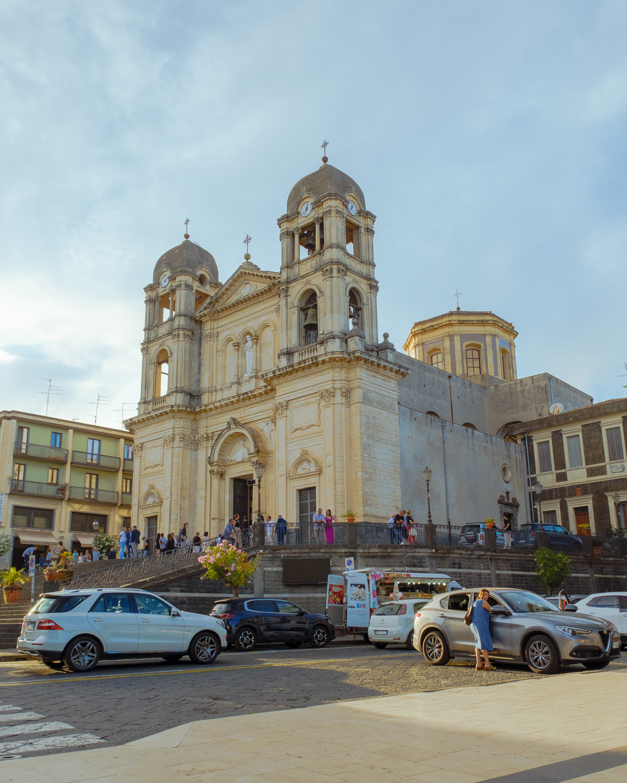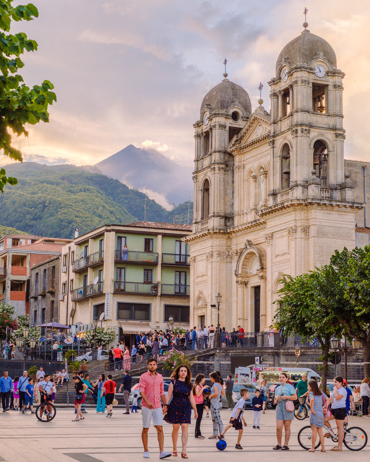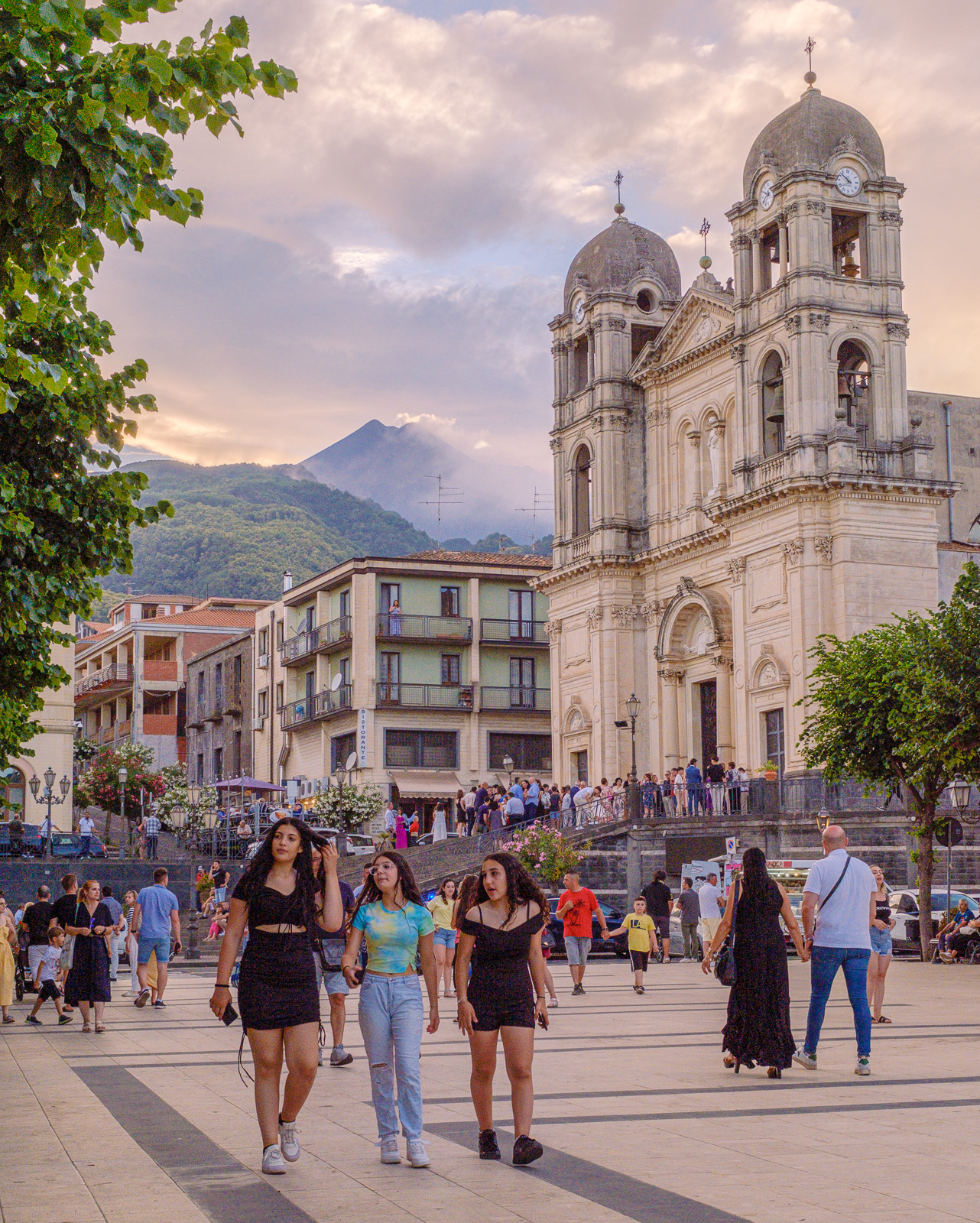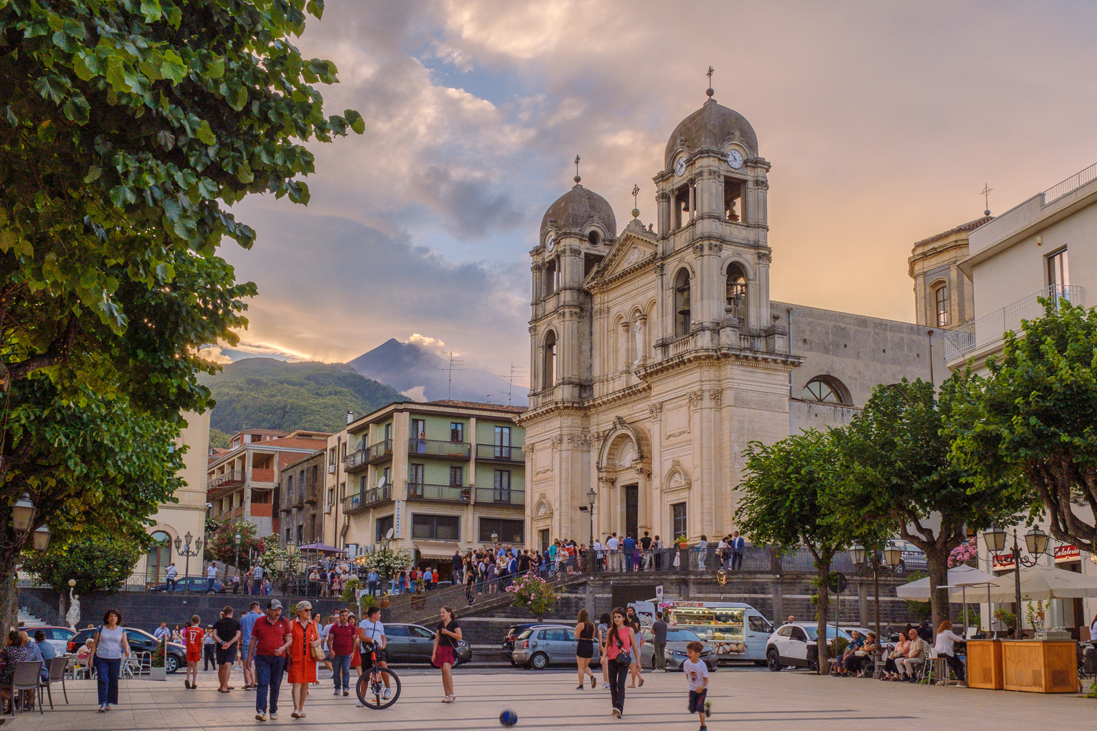 Era duminică seară și în mica piață din centrul orașului era o zarvă cum cred că numai la italieni poți întâlni: unii copii băteau o minge, alți făceau scheme cu bicicleta, câțiva adolescenți se plimbau de mână, adulții serveau ceva pe la terase și mai mulți seniori puneau țara la cale pe bănci. Toți vorbeau și gesticulau, rezultatul fiind o zarvă veselă și un vibe pozitiv. Într-un capăt al pieței, peisajul era întregit de o biserică mare unde avea loc o nuntă. Toată scena era dominată de Etna învăluită în nori și asezonată cu puțin fum. Atmosfera era atât de siciliană pe cât mi-o puteam eu imagina, mai lipsea doar ca socrul mare să fi fost capul mafiei locale. Poate era, cine știe.