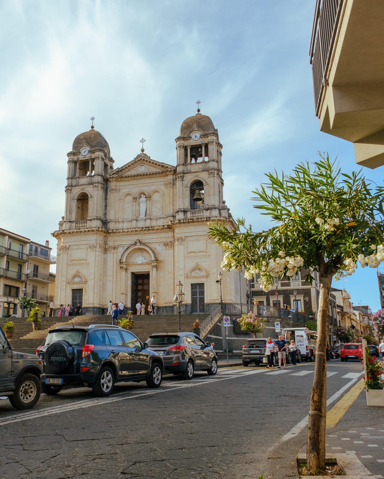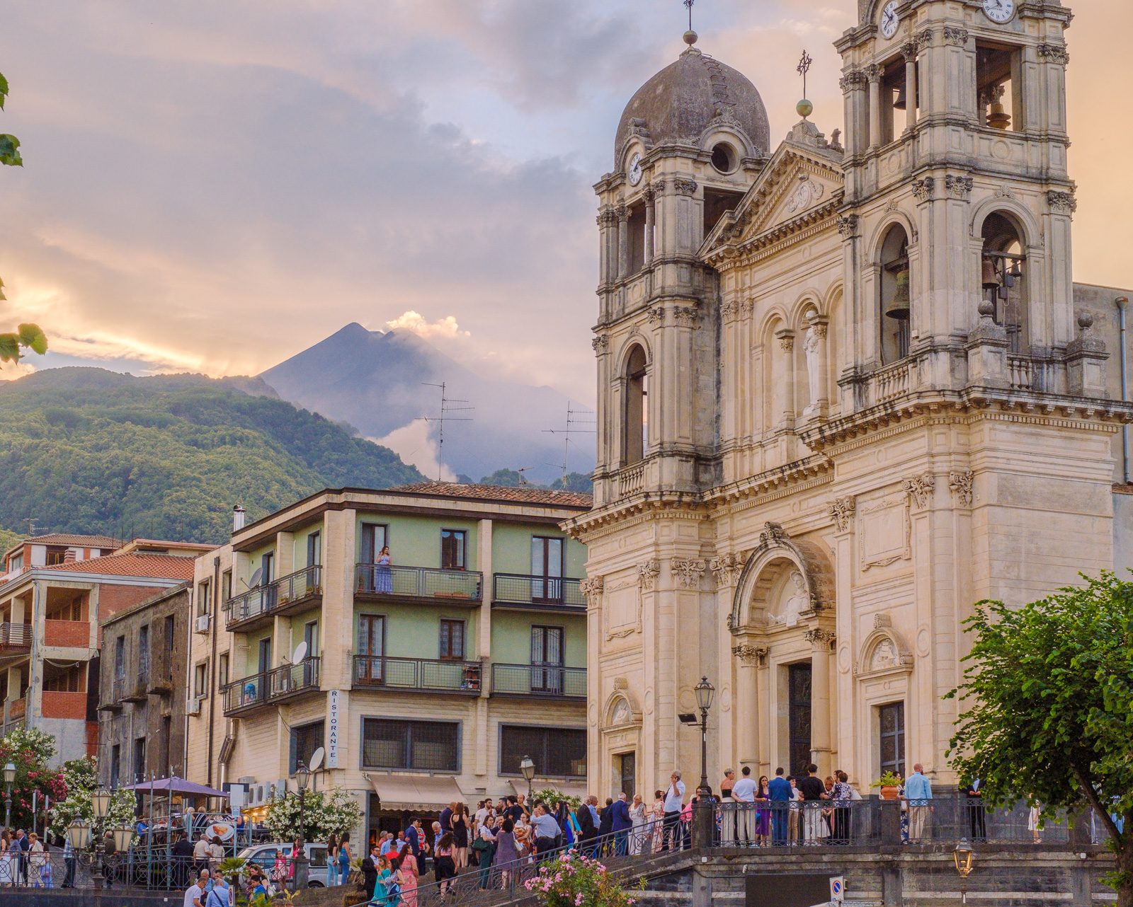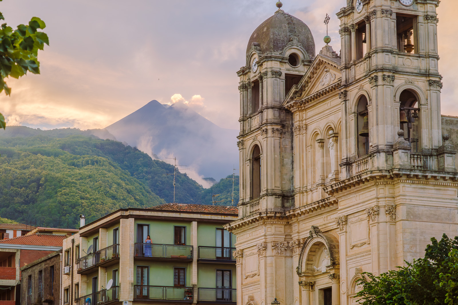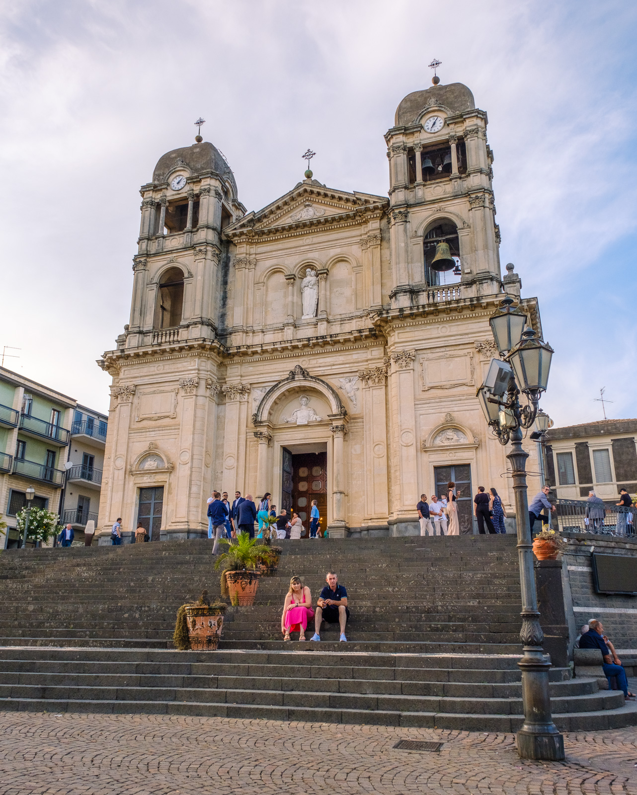 Era duminică seară și în mica piață din centrul orașului era o zarvă cum cred că numai la italieni poți întâlni: unii copii băteau o minge, alți făceau scheme cu bicicleta, câțiva adolescenți se plimbau de mână, adulții serveau ceva pe la terase și mai mulți seniori puneau țara la cale pe bănci. Toți vorbeau și gesticulau, rezultatul fiind o zarvă veselă și un vibe pozitiv. Într-un capăt al pieței, peisajul era întregit de o biserică mare unde avea loc o nuntă. Toată scena era dominată de Etna învăluită în nori și asezonată cu puțin fum. Atmosfera era atât de siciliană pe cât mi-o puteam eu imagina, mai lipsea doar ca socrul mare să fi fost capul mafiei locale. Poate era, cine știe.