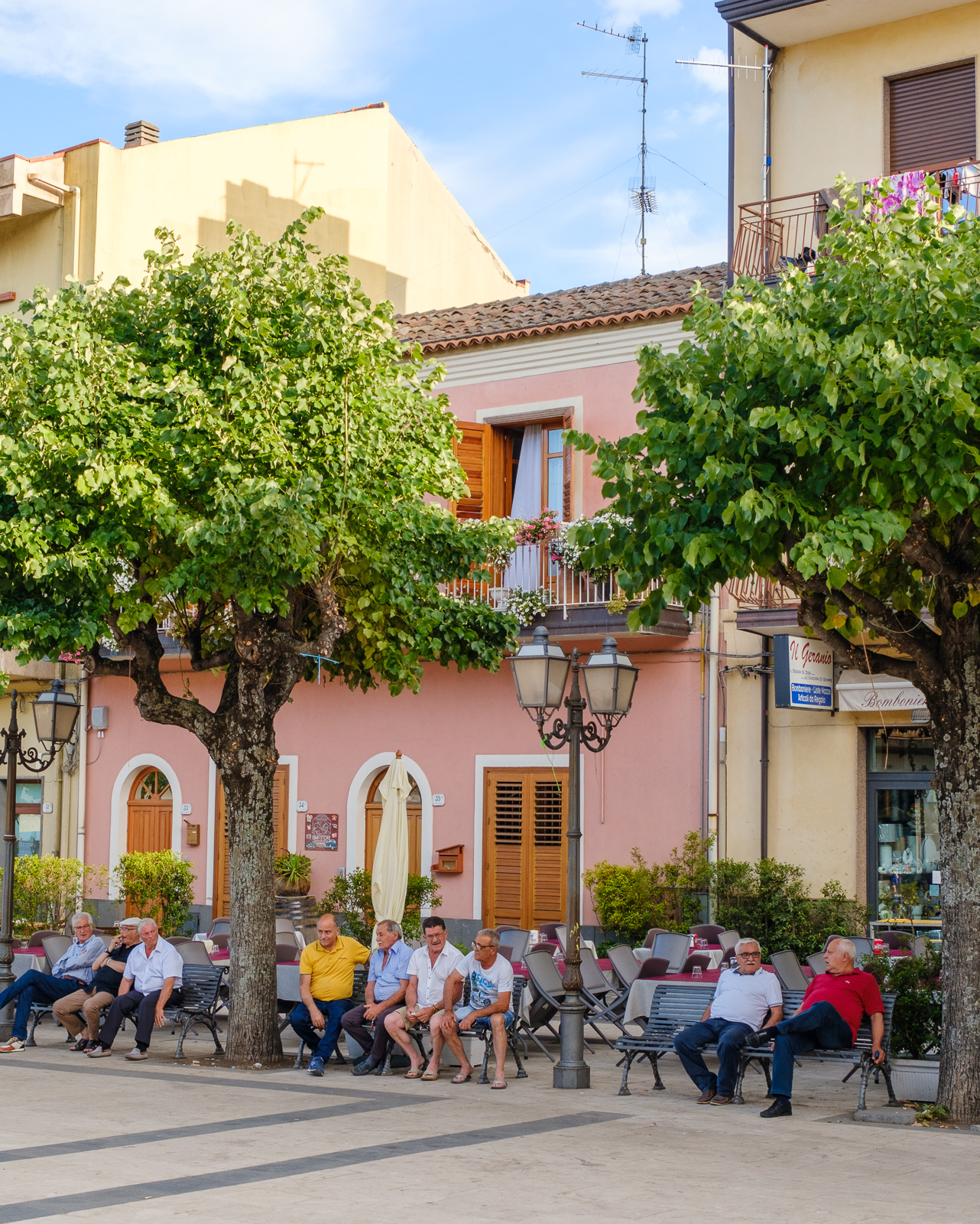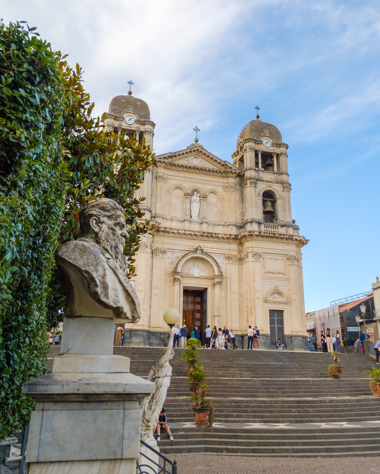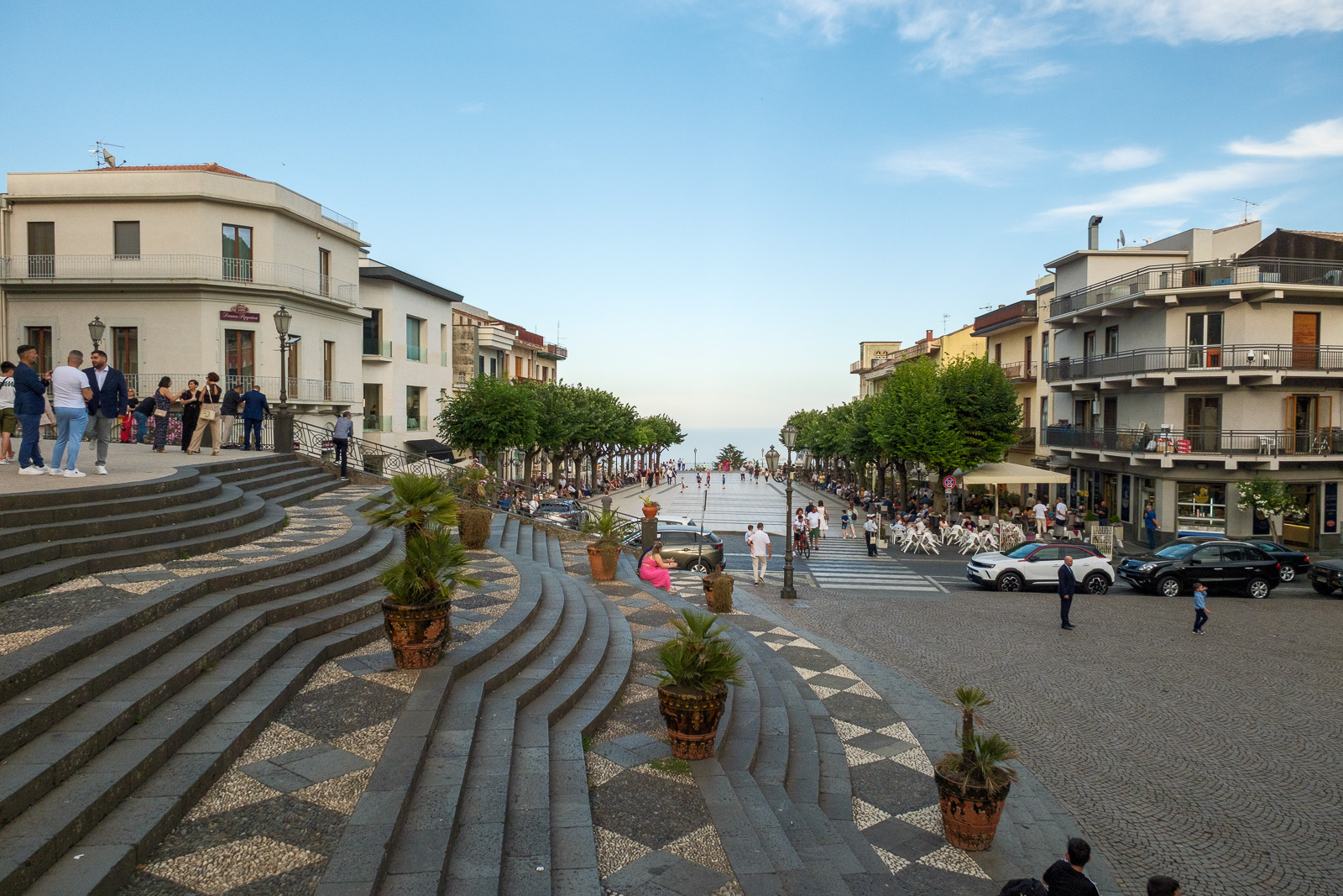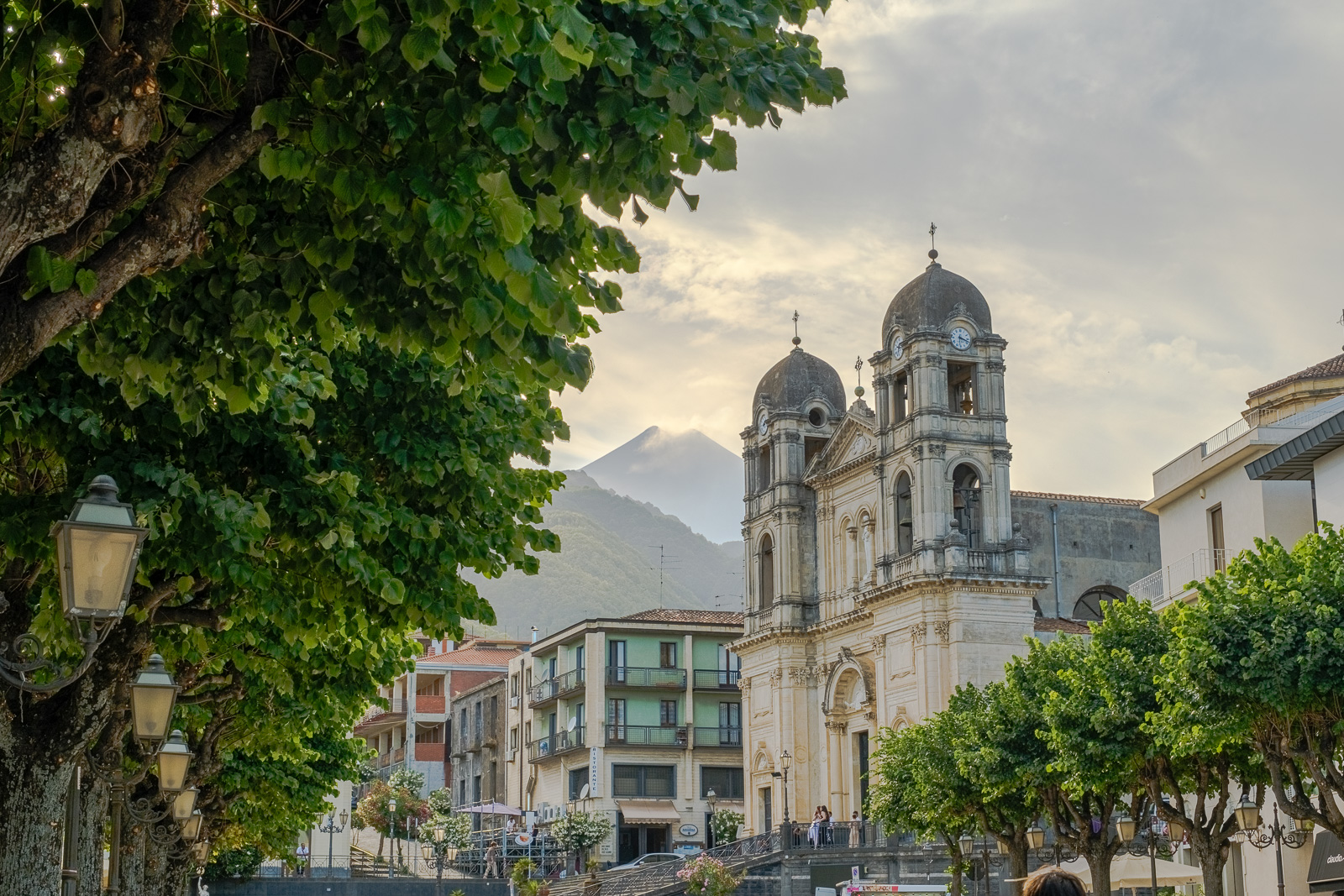 Era duminică seară și în mica piață din centrul orașului era o zarvă cum cred că numai la italieni poți întâlni: unii copii băteau o minge, alți făceau scheme cu bicicleta, câțiva adolescenți se plimbau de mână, adulții serveau ceva pe la terase și mai mulți seniori puneau țara la cale pe bănci. Toți vorbeau și gesticulau, rezultatul fiind o zarvă veselă și un vibe pozitiv. Într-un capăt al pieței, peisajul era întregit de o biserică mare unde avea loc o nuntă. Toată scena era dominată de Etna învăluită în nori și asezonată cu puțin fum. Atmosfera era atât de siciliană pe cât mi-o puteam eu imagina, mai lipsea doar ca socrul mare să fi fost capul mafiei locale. Poate era, cine știe.