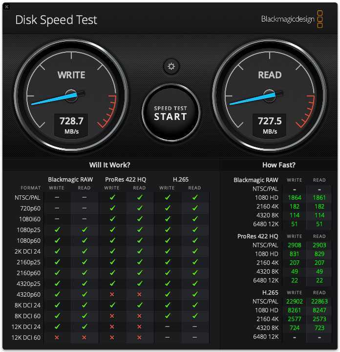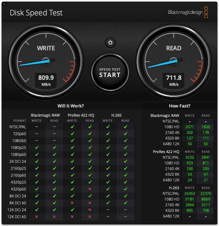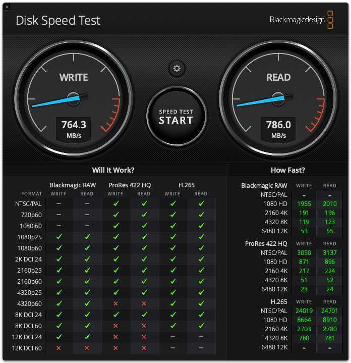 Viteza am testat-o cu Blackmagic Disk Speed Test, care nu e un super program de testare, dar e destul de bun să-ți faci o idee.