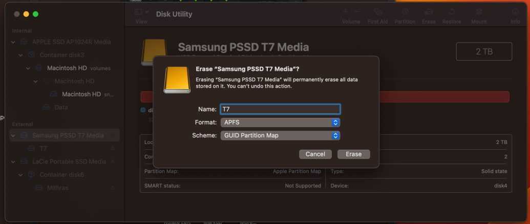 Am un nou Samsung T7, micuț și albastru metalizat, de 2TB, pe care îl voi folosi pentru a face backup la multele fotografii pe care le prelucrez pe laptop. Și pentru că era gol, am zis să-l testez în ideea de a alege formatul de fișiere cel mai rapid. Sistemul de operare MacOS îți permite să formatezi un SSD în sistem APFS (Encrypted, Case-sensitive și Encrypted cu Case-sensitive), Mac OS Extended (Journaled și Case-sensitive Journaled), ExFAT și MS-DOS (FAT). Am scos din calcul formatul MS-DOS, pentru că este antic și nu permite fișiere mai mari de 2GB.